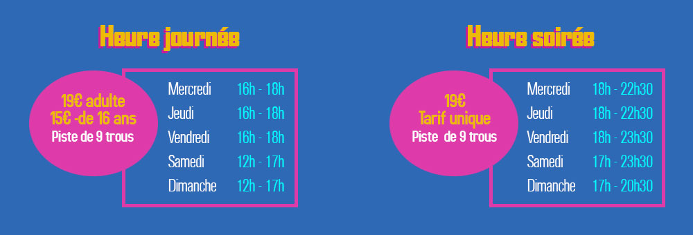Votre réservation correspond à l’heure de votre check in auprès de notre staff. Lors de fortes affluences en soirée ou weekend, ce temps peut augmenter. Merci de prévoir 10-45 minutes d’attente avant de commencer votre putt. Le golf est un sport qui nécessite de la patience, nous ne sommes pas tous au niveau de Tiger Woods. L’espace restauration vous est accessible dès votre arrivée.