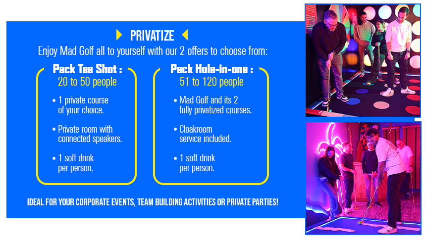 MAD GOLF is a mini-golf in a selfie paradise; two different universes, a lounge area, unique alcoholic and non-alcoholic cocktails, and much more! Mad Golf opens its doors to you in the 2nd district of Paris, a stone’s throw from the Réaumur-Sébastopol (metro lines 3 and 4) and Strasbourg-Saint-Denis (metro lines 4, 8 and 9) stations.