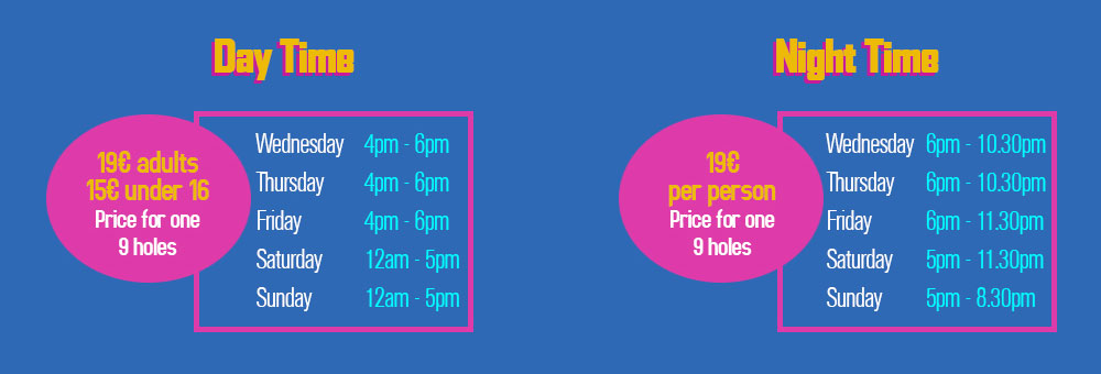 When booking, you will have the option of choosing one of our two golf courses, Sunset or Flashback. Depending on the availability, you may need to select another time or course.