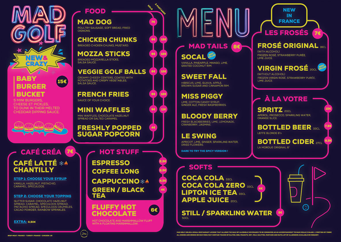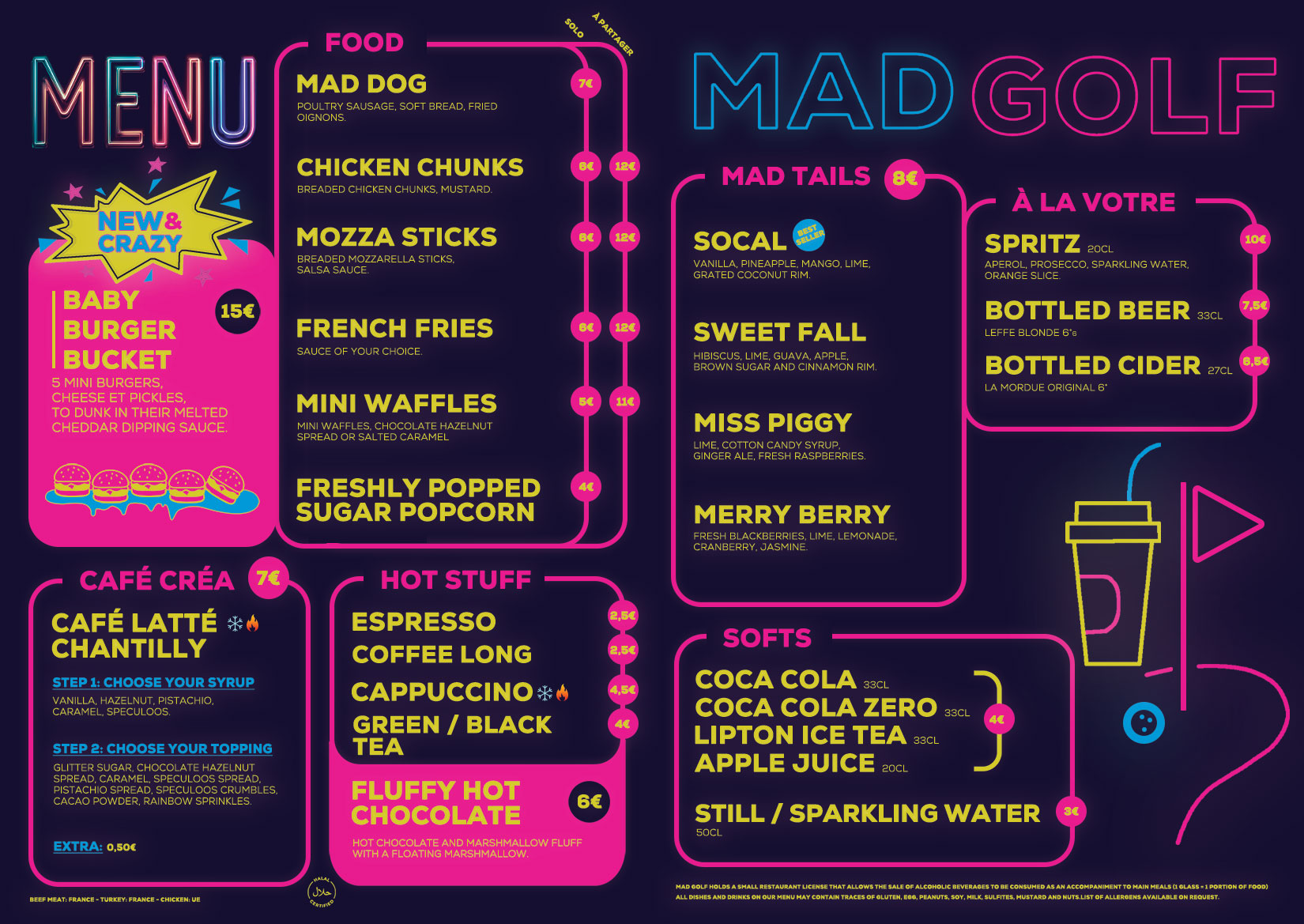 MAD GOLF is a mini-golf in a selfie paradise; two different universes, a lounge area, unique alcoholic and non-alcoholic cocktails, and much more! Mad Golf opens its doors to you in the 2nd district of Paris, a stone’s throw from the Réaumur-Sébastopol (metro lines 3 and 4) and Strasbourg-Saint-Denis (metro lines 4, 8 and 9) stations.